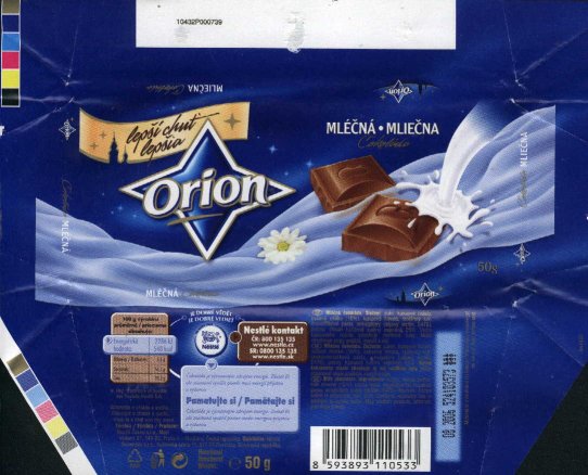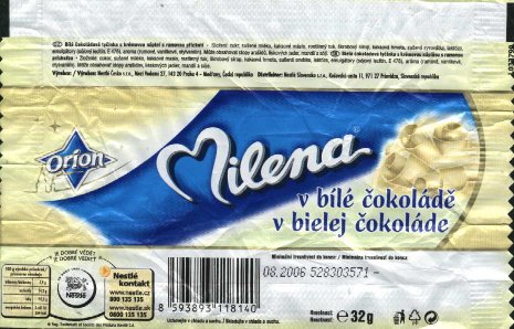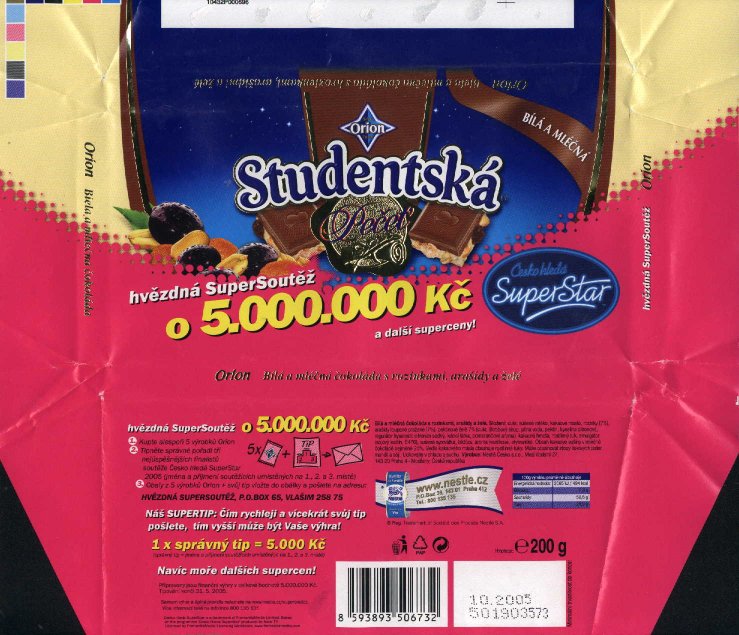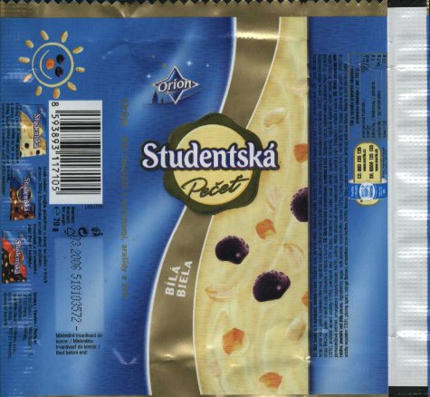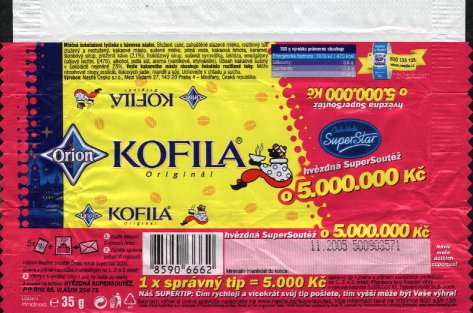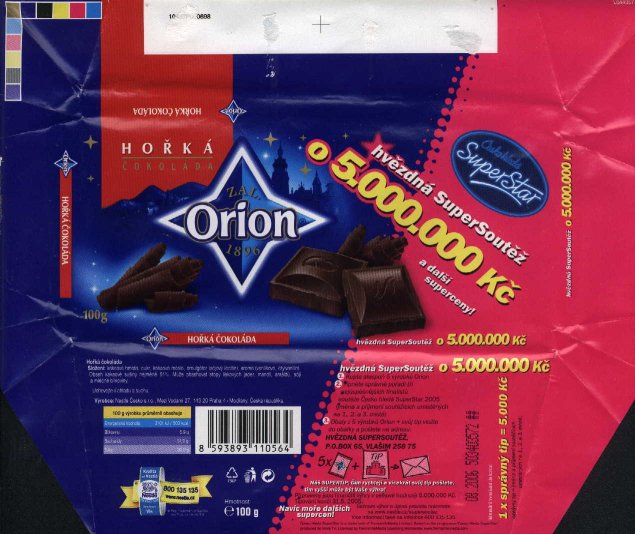 There are also new wrappers Česko hledá Superstar (popidol) at market. Since 2004 Zora factory in Olomouc manufactures chocolates Boci and Nestle for Hungary because hubgarian factory in Szerencs was closed down. Orion has launched 70g Studentská pečeť bars in 3 sorts in August 2005. White Studentská pečeť is available again now. Milena, Kofila and Ledové Kaštany are available in white chocolate in November 2005. |