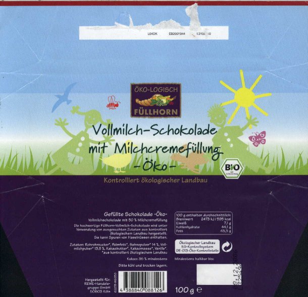 Chocolate wrappers from chocolate bars made for Rewe stores with brands Rewe, Rewe Bio, Ja, Fülhorn.