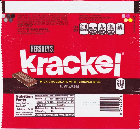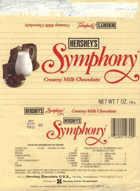 1925. Hershey introduced milk chocolate with rice crisp and almonds Krackel in 1938, in 1939 also peanuts were added and since 1941 Krackel contains only rice crisp. Milk chocolate SYMPHONY was launched in 1990. |