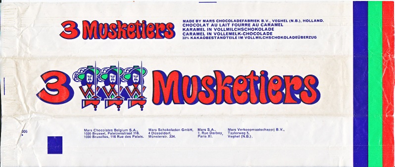 chocolate candy bars Tunes, 3 Musketiers, Nomad (later dark Bounty) and