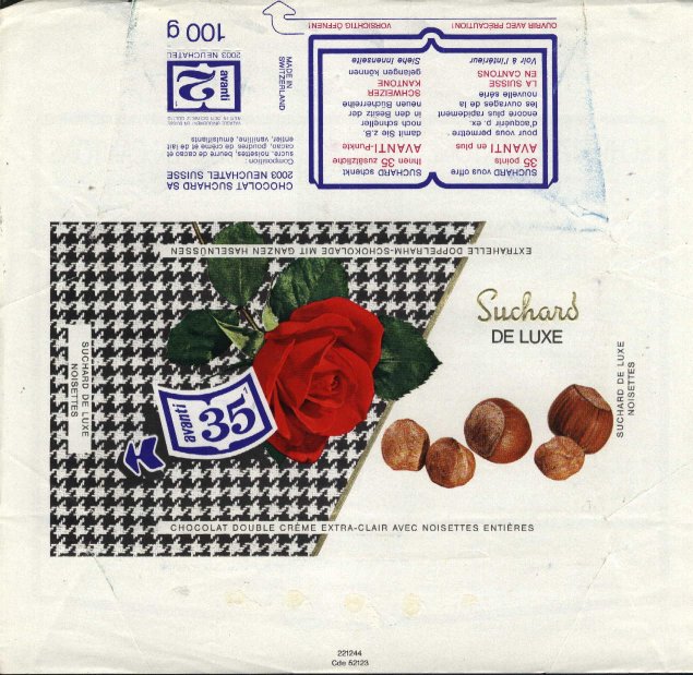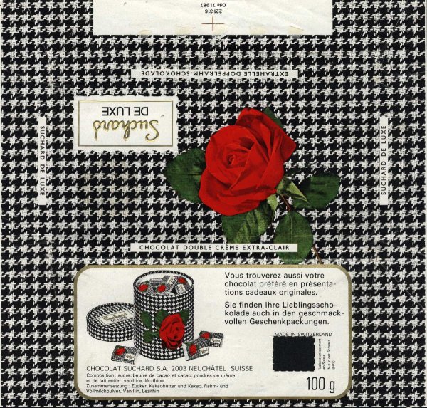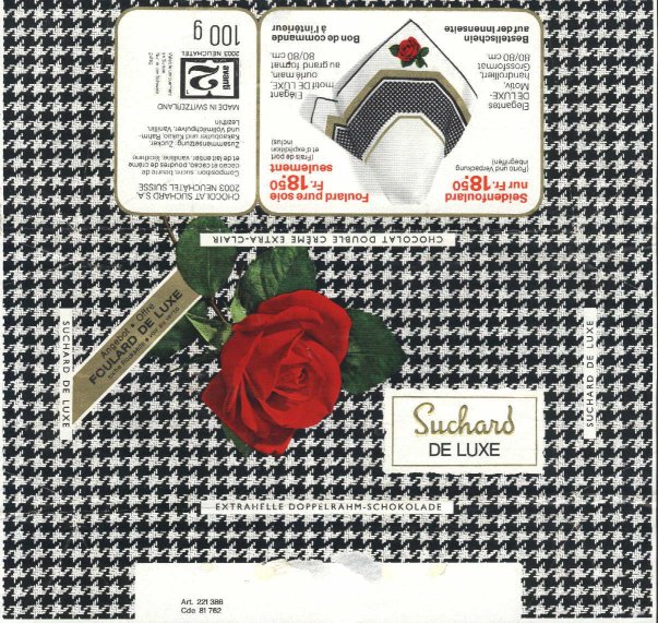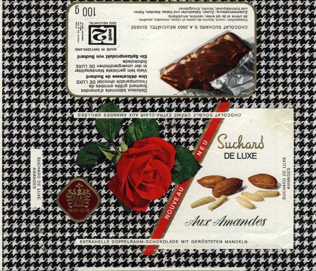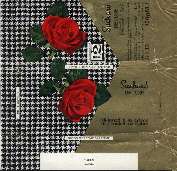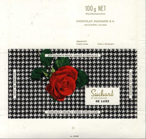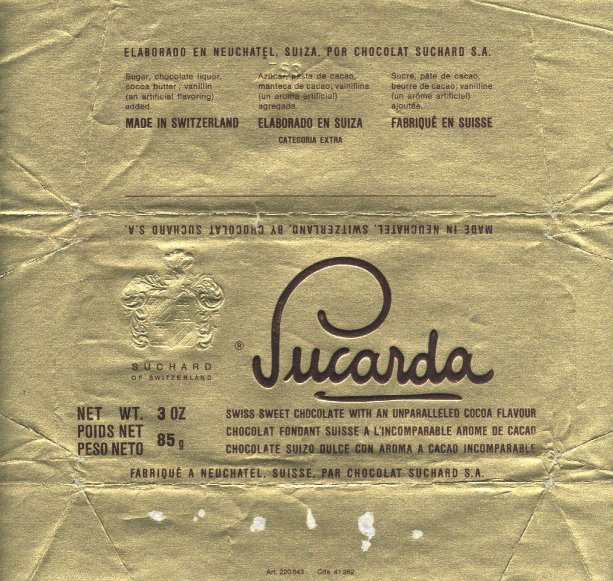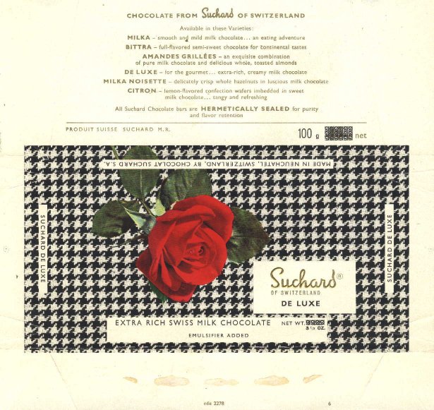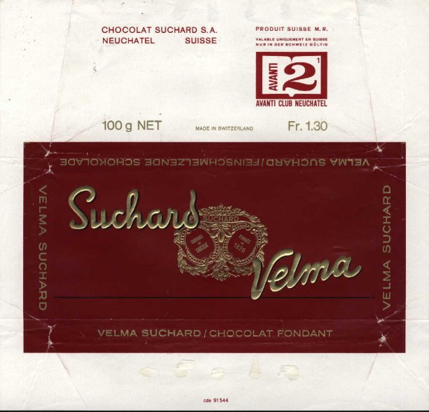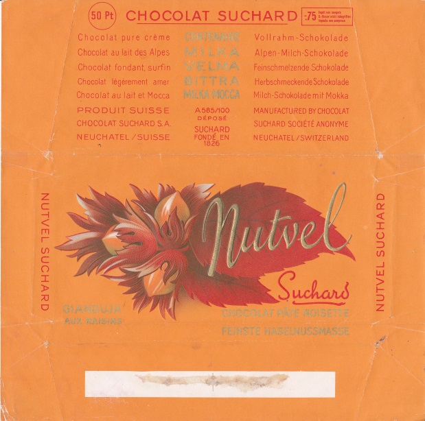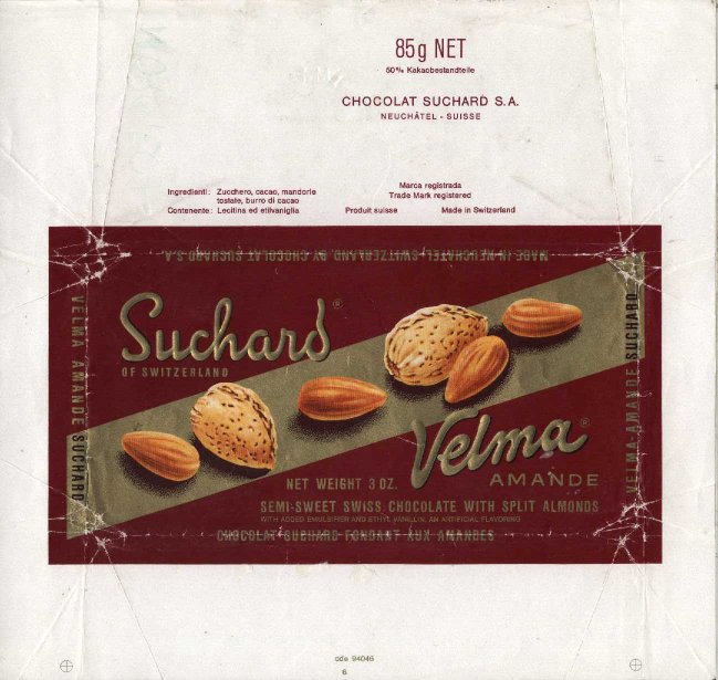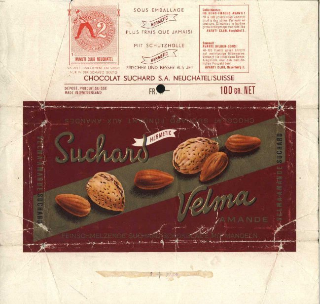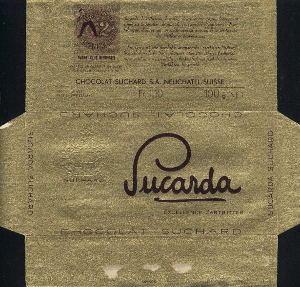 Čokoládové obaly hořkých čokolád Bittra, Velma (vyrábí se od roku 1901), Sucarda, čokolády se smetanou Centenaire (vyvinuta k stému výročí firmy roku 1926), čokolády De Luxe. |